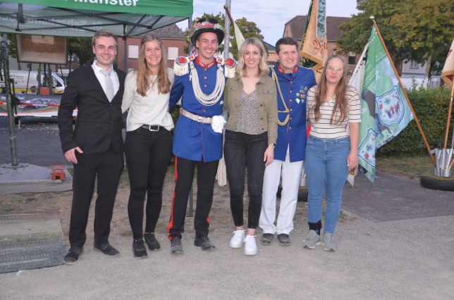 Auf dem Festplatz hielt der Präsident der Schützenbruderschaft, Harald Pasch, seine Ansprache und versorgte alle Schützen und Ehrengäste mit einem Kaltgetränk. Klaus van Scherrenburg bekam vom Präsidenten für seine Verdienste für „Glaube, Sitte und Heimat“ das silberne Verdienstkreuz verliehen. Das scheidende Königstrio um König Thomas Funken ließ ebenfalls die vergangenen vier Jahre Revue passieren, und bedankte sich, wie der Präsident, bei allen für die tolle Unterstützung und Organisation.